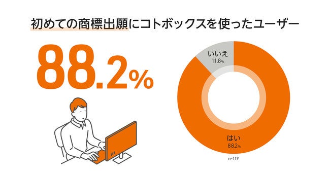 一昨年10月に実施したコトボックスユーザーを対象とするアンケートでは、初めての商標出願でコトボックスをご利用頂けたという回答が88%に上り、商標出願に対するハードルの減段に貢献を示した他、知的財産の分野におけるDXにも影響を与えたことがわかる結果となりました。また、「今後の商標出願予定が1年以内にある」もしくは「未定」と答えた方への質問で、「次回以降の商標出願もまたコトボックスを利用しますか?」という質問に対し、96%のユーザーから「利用する」という回答を頂いております。